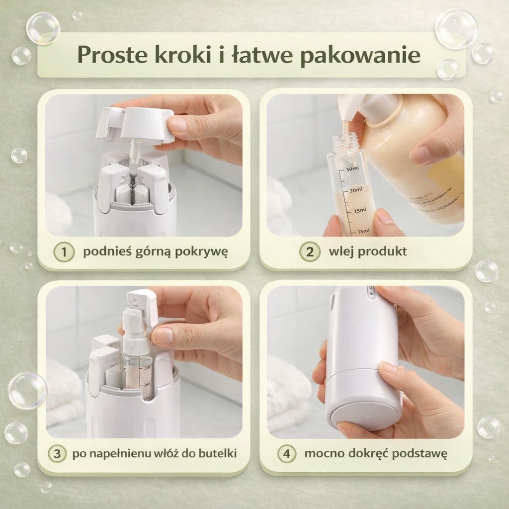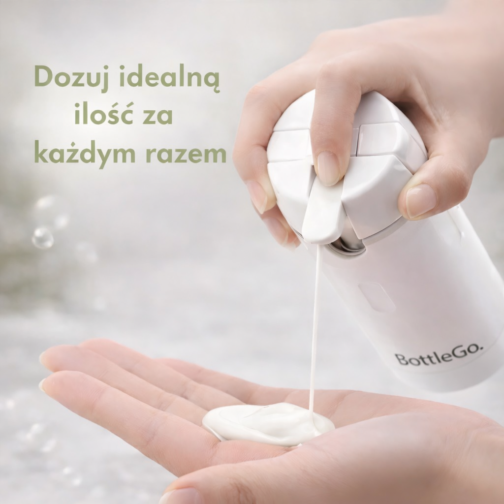 BottleGo™ pozwala dozować kosmetyki jednym ruchem, bez odkręcania kilku opakowań i bez plam w kosmetyczce.
