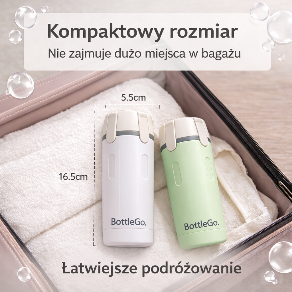 BottleGo™ nie zajmuje dodatkowego miejsca i jest lekki, więc spokojnie zmieści się w kosmetyczce, torebce i bagażu podręcznym.