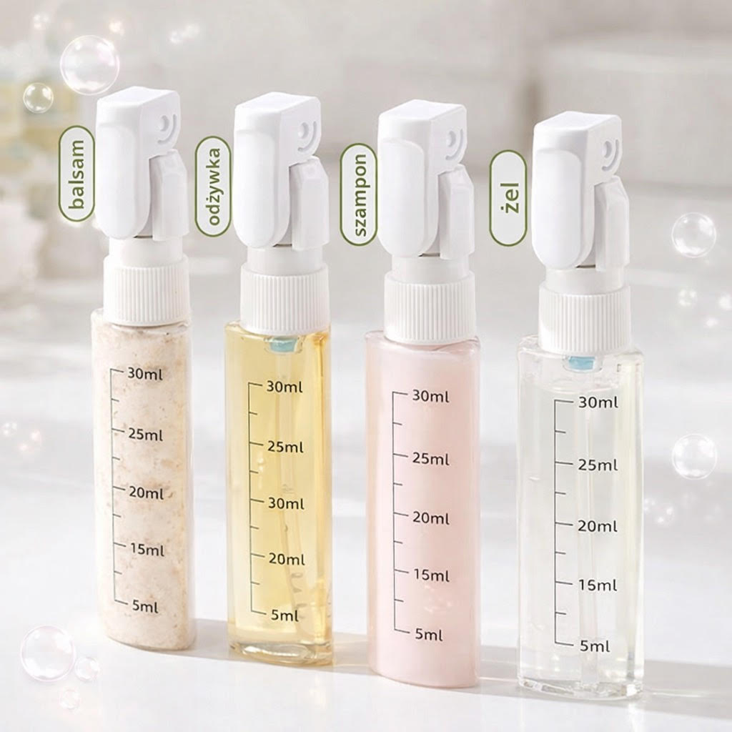 Każdy pojemnik ma oznaczenia w mililitrach, dzięki czemu łatwo dopasujesz ilość kosmetyku do wyjazdu.